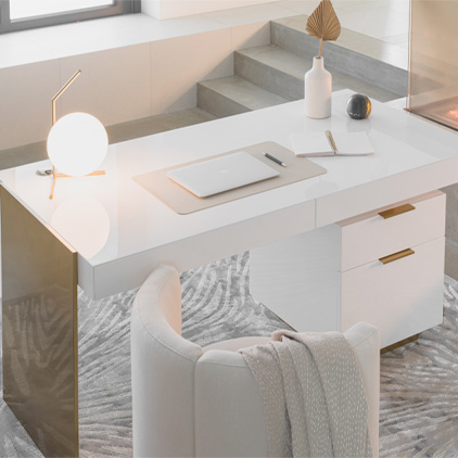 The focal point of any home office is the desk, when designing your office consider how the desk compliments your interior design style and the other pieces of furniture in your work-from-home space. Add a sense of luxury to your office with a minimal and sleek desk with gold accents like our Arlo Desk in Glossy White Lacquer and pair it with a plush, upholstered chair in a similar tone like our Nova Lounge Chair in Alesund for a sophisticated look.