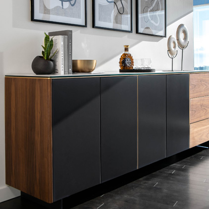 If you have space think about adding a contemporary sideboard or storage unit like our Augustus Sideboard in White Marble and Walnut, in your office to hide away anything you don’t want out in the open and can also be a place for you to display your art and décor pieces.