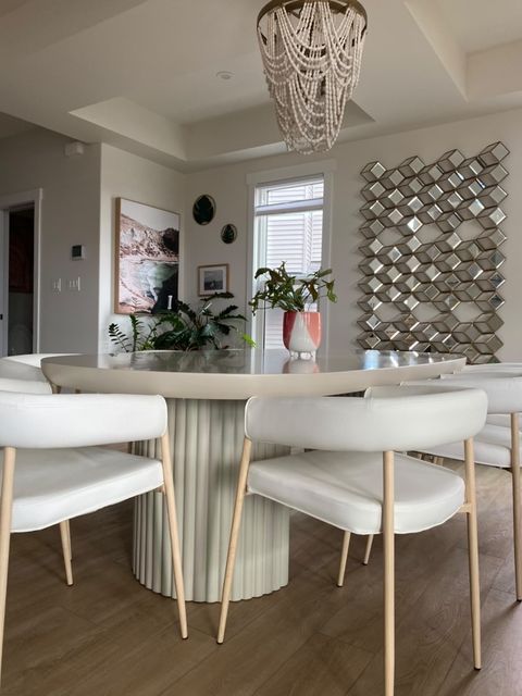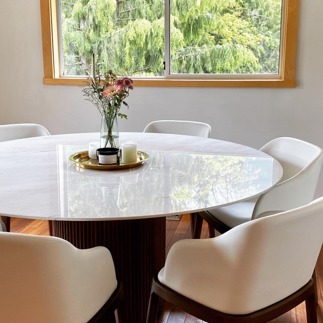 Mixing various materials together in one space may seem like a daunting task, however mixing stone materials with wood can be quite beautiful when executed well. Choose a round dining table with a lustrous marble top and tambour pedestal base in a deep wood tone like the Athena Round Dining Table and pair it with a dining chair that features wood legs in the same tone as the dining table like the Aubrey Armchair for a cohesive look.