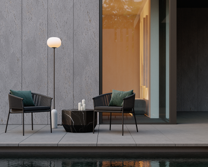 If you want your space to stand out consider going for a darker color palette. Not only will it make a big impression with your guests but it will also evoke a bold and sophisticated feel to your outdoor space. Start off with a couple of accent chairs in a dark color like our Afton Outdoor Lounge Chair in Arcadia with a jewel-toned throw pillow if you’re not ready to commit to a whole all-black outdoor set.
