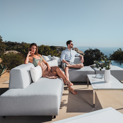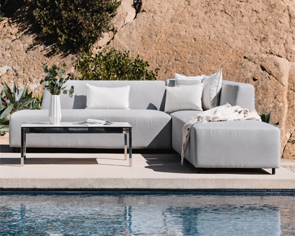 To enhance the look of your outdoor space, consider adding pillows and throws in different colors and textures to add depth and dimensions to your outdoor sectional. To create a cohesive look choose a neutral outdoor sectional like our Mika Outdoor Modular Sectional in Encino and pair it with pillows and throws in a similar color palette.