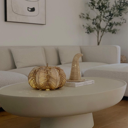 Add some subtle Halloween themed decor pieces in your living space like a plush pumpkin shaped throw pillow in a similar fabric as your sofa for a modern way to decorate your home without going overboard.