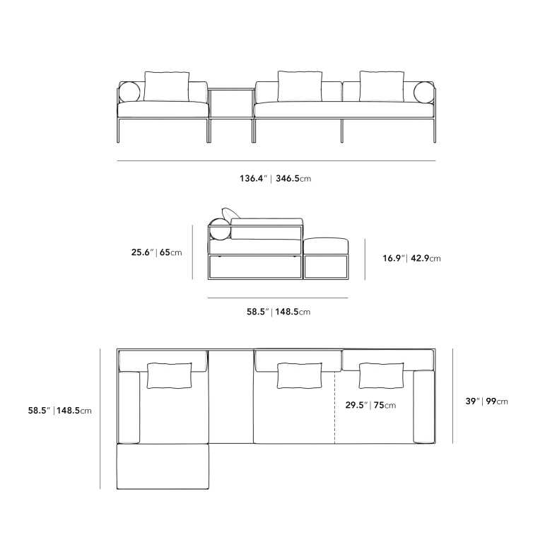 - Includes one 2-seater piece, one corner piece, one ottoman, one side table, three back cylinder cushions, two arm cylinder cushions, and three throw pillows