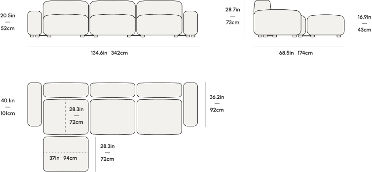 - This set includes 3 backrests L, 2 armrests, 4 ottomans L, 3 backrest pillows L, connectors