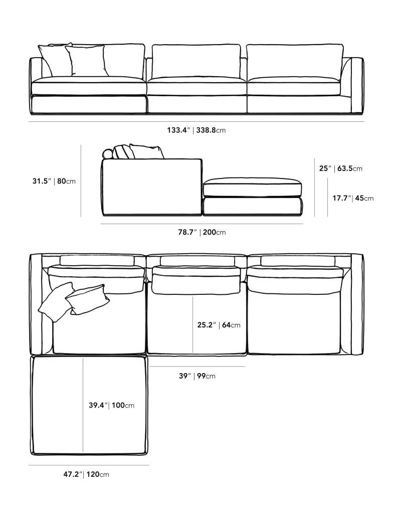 • Includes 1 left arm piece, 1 armless piece, 1 right arm piece, 1 ottoman, and 4 throw cushions