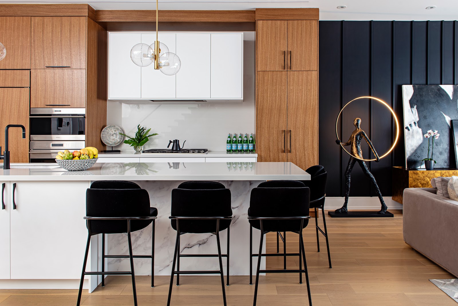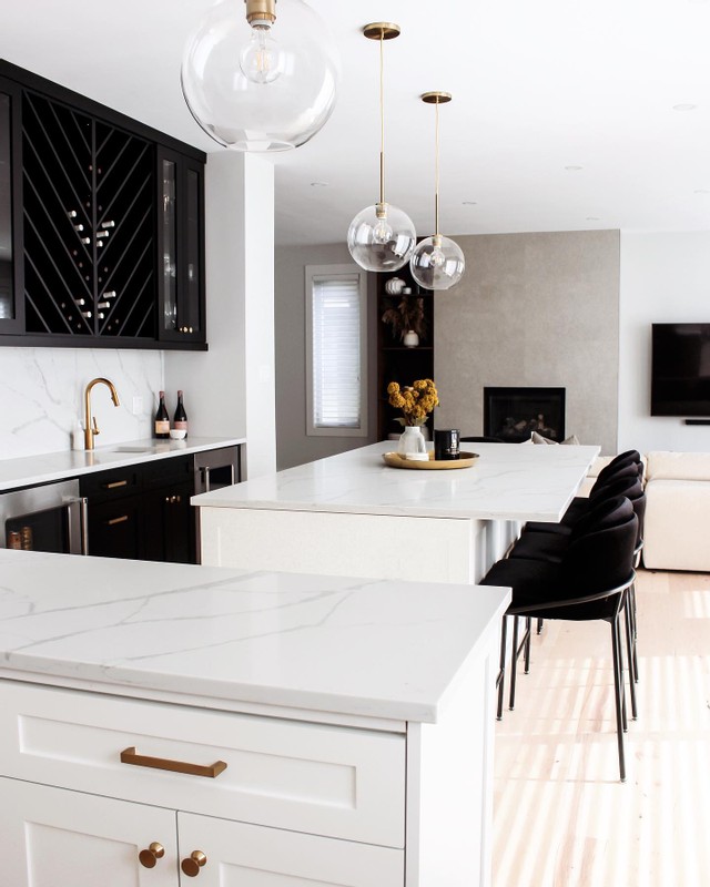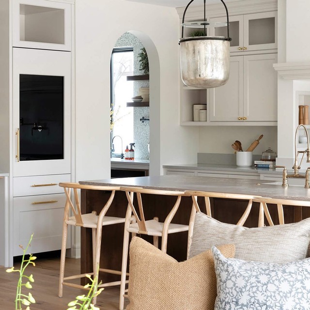 One of our favorite looks is this modern kitchen space featuring neutral whites and beiges with accents of black and brass gold that create contrast and visual interest to this contemporary space. To create a bold and elevated kitchen space pair a neutral kitchen with a plush, upholstered counter stool like the Angelo Counter Stool in Black, Vintage Velvet with Black Metal for a dynamic look.