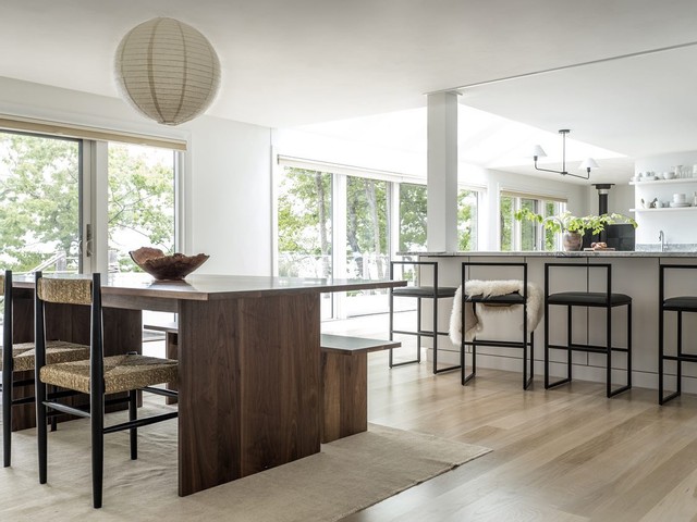 Incorporate a classic silhouette with backrests and armrests in wood materials, like the Wishbone Counter Stool in Natural with Natural Seat Cord for a warm and inviting look.