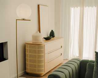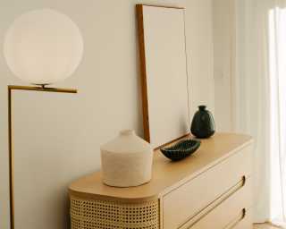 Delight in the sophisticated warmth of the Wishbone Dresser. Subtle yet elegant, the natural wood and cane detailing unites with the contemporary curves of this modern dresser to create a timeless balance in any bedroom.